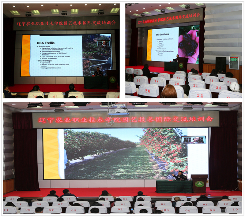 帕特里克.拜尔斯教授从事园艺行业40余年,在国内外30多个学术组织任职,目前负责密苏里州西南部17个县的商业和家庭园艺项目,是园艺产业行业中的资深学者。会上,拜尔斯教授向与会师生介绍了黑莓生产的创新成果——“旋转横臂架”——该型支架可改变黑莓种植方向,提高收获效率,减少树体和花芽受害;提出最适合旋转横臂架果园生产地选择,无刺黑莓品种选择、种植和支架安装使用及管理步骤;论述了旋转横臂架无刺黑莓品种的表现。报告中,他还与参会教师围绕设备购置、果实采收等问题进行了交流研讨。